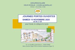 Journée Portes Ouvertes – 15 novembre 2025 Le Groupe scolaire Sœur Rosalie Louise-de-Marillac organise sa Journée Portes Ouvertes le samedi 15 novembre 2025, de 9h